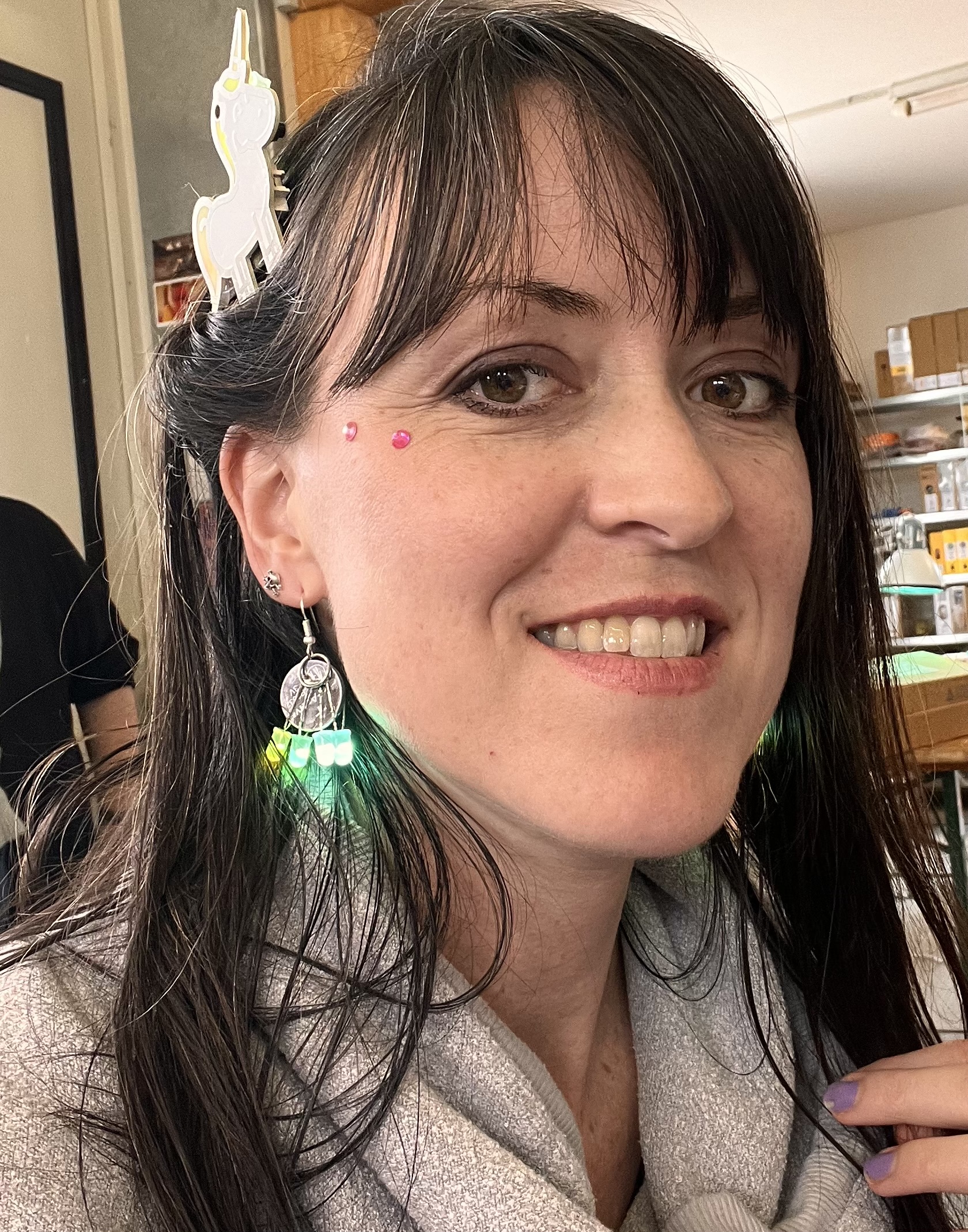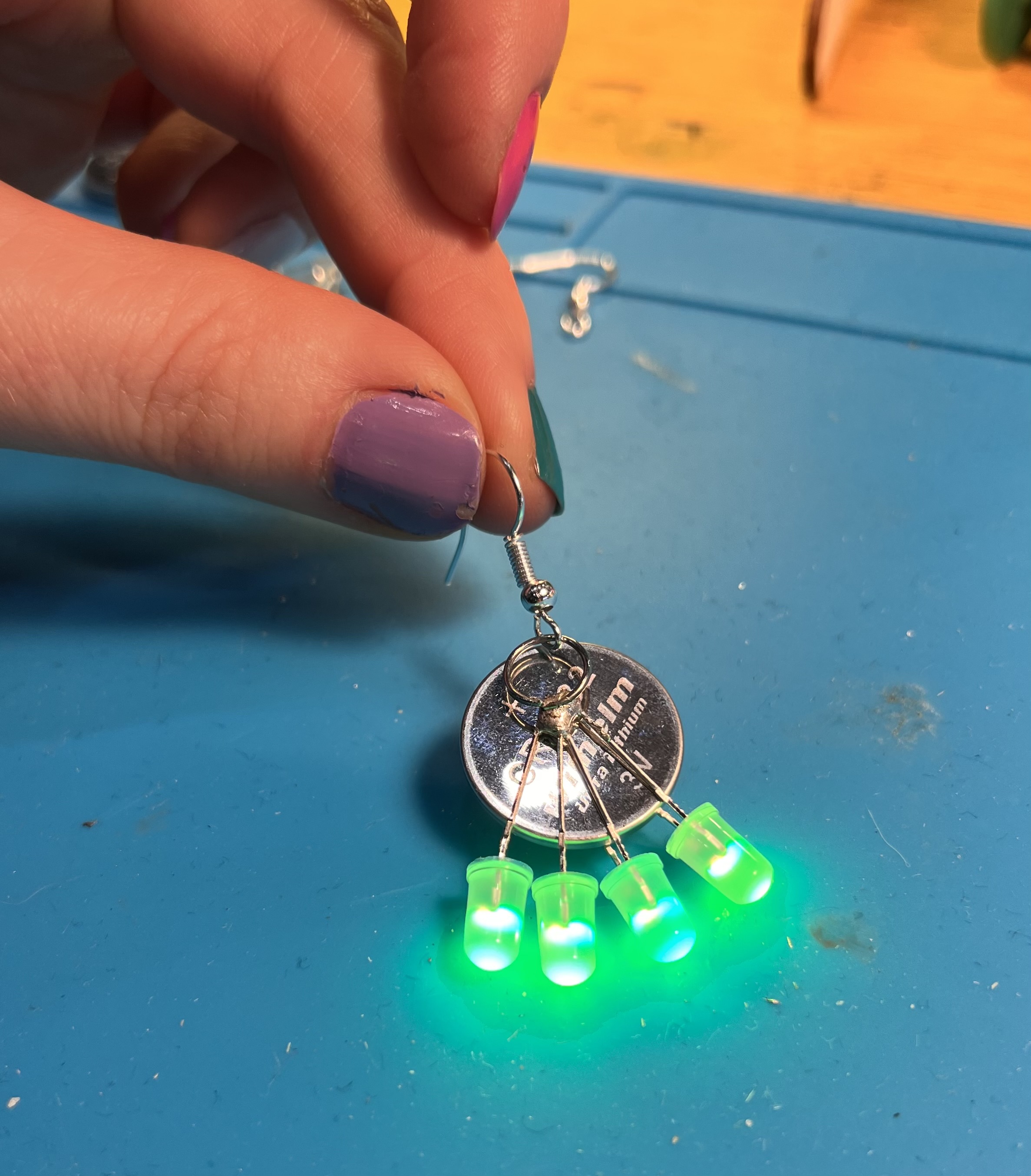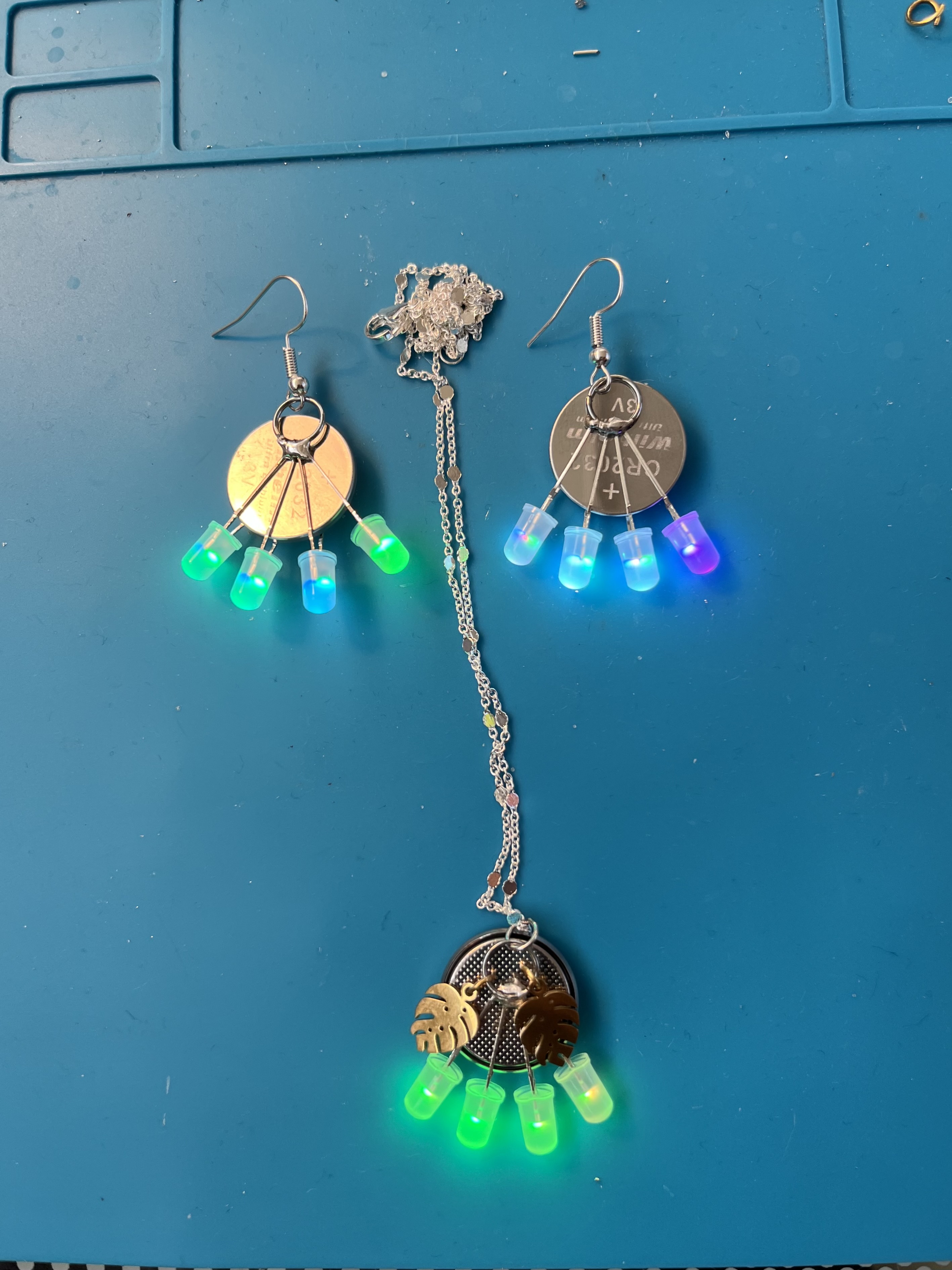 A very simple soldering kit with four LEDs. The four LEDs are connected with a few wires to a battery holder. As soon as a battery is inserted, the LEDs light up in all colors of the rainbow. Thanks to the clothespin, you can easily attach the artwork afterwards. No big soldering skills are needed for this kit. It is really ideal even for children and teenagers.