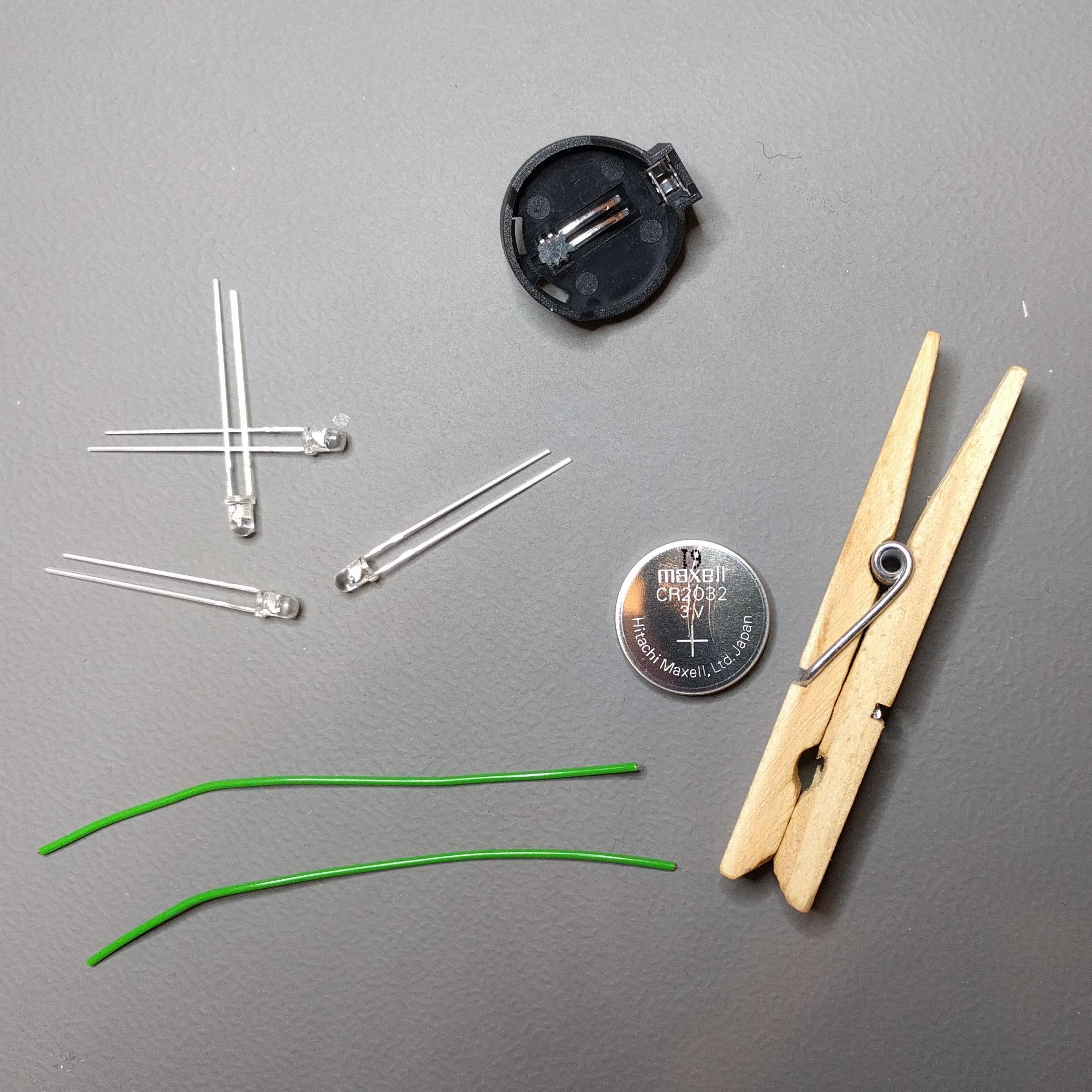 A very simple soldering kit with four LEDs. The four LEDs are connected with a few wires to a battery holder. As soon as a battery is inserted, the LEDs light up in all colors of the rainbow. Thanks to the clothespin, you can easily attach the artwork afterwards. No big soldering skills are needed for this kit. It is really ideal even for children and teenagers.